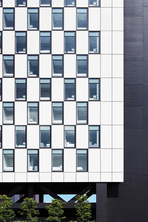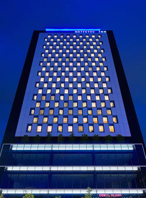 受賞コメントリニア関連再開発の見込まれる地区の先駆けとして、駅前立地によるランドマーク性の獲得と、遠景からの視認性を求め、幾何学的な強さをもったファサードデザインを目指した。壁(白)と窓(黒)で構成される幾何学は〈点〉で交わることで視覚的な強さを、また陰影的な表現により奥行を表現した。全体を黒のキャンバスに浮遊させることで大きな市松を印象化し、内部 ホテル客室の明かりは夜のランドマーク性の一役を買っている。