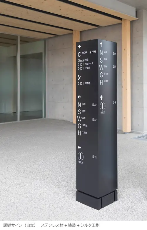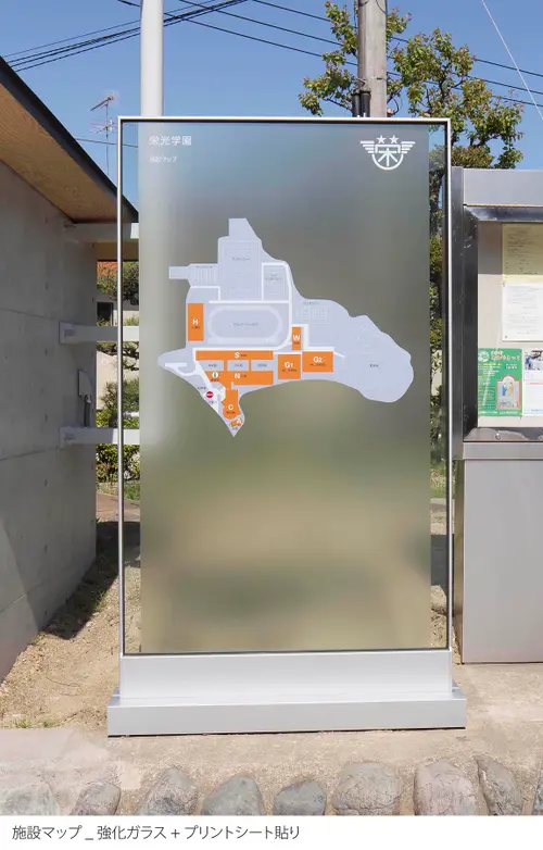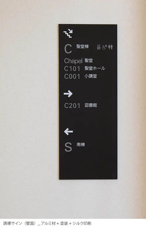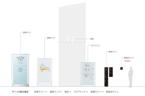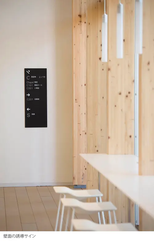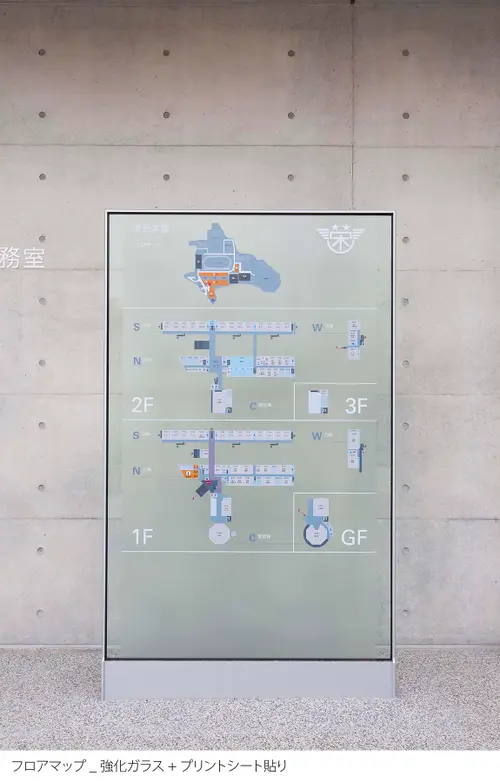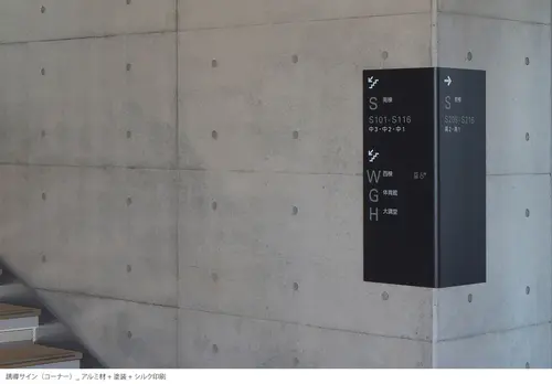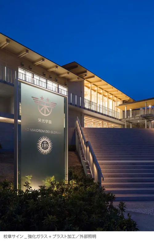 受賞コメント栄光学園新校舎は、分かりやすいプランと「木とガラス」を多用した明るい雰囲気が特徴である。各サインは、統一的な色彩でシンプルな素材とし、建物イメージと調和を図りつつ、視認性を高めた。英数字表記を基本とし、校章サインから棟名・誘導・教室名サインまでの流れが、海外からの訪問者にも分かりやすい伝わりやすいシステムとした。校章サインは「みらいの学校」を目指す、シンボリックなモニュメントとして設置している。