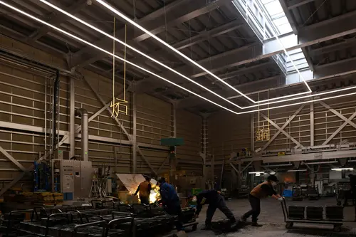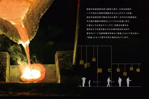 受賞コメント富山県高岡市で100年続く鋳物メーカー「能作」の新社屋。 地域の伝統産業を担う鋳物工場で、大切な役割である工場見学を中心としたサイン計画。 工場という大きな空間、なおかつ危険な作業中、遠目からでも認識できるよう漢字サインで見学者にその場の機能を視覚化しシンプルに伝達する。 サインは自社の伝統技術・真鍮鋳物で製作し、そのパーツは鋳造特有の「湯道」によって支えあい、「湯道」によって壁や天井に固定されている。