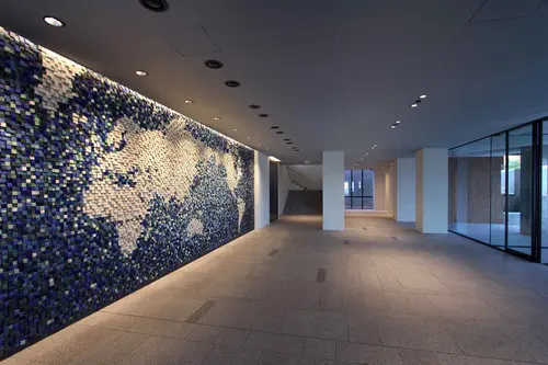 受賞コメント世界で活躍する人材の輩出を願うモニュメントとして本壁画は整備された。多様な釉を施した陶で世界地図を表現。海は中央から全方への濃淡によりタイトルの示すベクトルを表す。陸は可能性を象徴する白とした。凹凸が壁面へ彫刻的な陰影を成す。