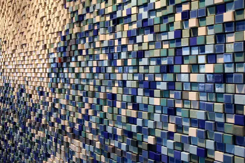 アイデンティティを確立しつつ全体の調和を成す様を、焼ムラにより各々異なる陶の集合で表現し、建学の精神にうたわれる“和の貴さ”に想う空間装飾とした。