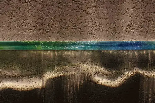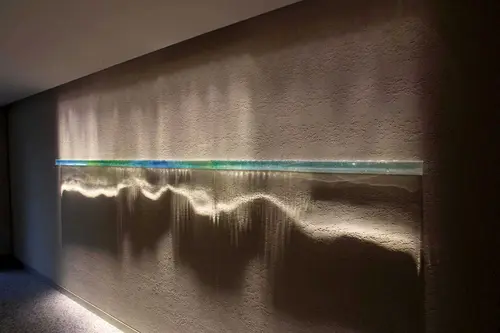受賞コメントカナルに面する集合住宅に、水辺を印象化したガラスオブジェクトを配置した。遠浅の海辺を想わせる光と透明感を、積層し加熱溶着した工芸ガラスの繊細な質感で表現した。