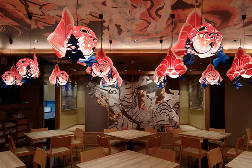 受賞コメント空間コンセプトは「青森ねぶたワールド」。ねぶたを潔くデザインすることを心がけ、特に店内に入るとすぐに目を引く、ねぶたは本物で、一度、使用されたものを青森県からお貸しいただき、ディスプレイしてしています。ねぶた師の奏でるアート性を最大限に引き出すように、ミラーを駆使し、上から横から様々な角度から、ねぶたの顔や頭が見られるように工夫しています。