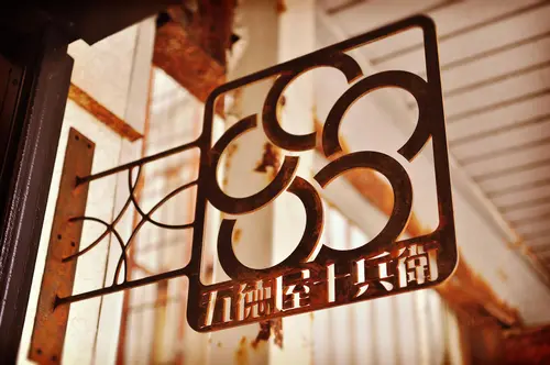 商店街の一角にある五徳屋十兵衛の突出サインは、5mmの鉄を切り抜き塩酸によって酸化させた。この町の雰囲気を壊さず、町に溶け込みながらあたかも長年そこに付いていたかの様なサインを計画した。