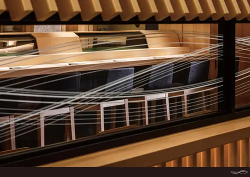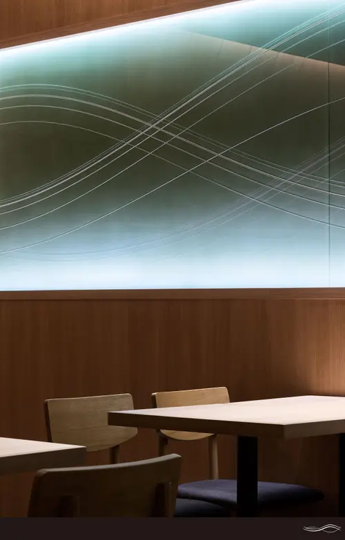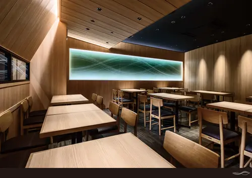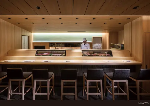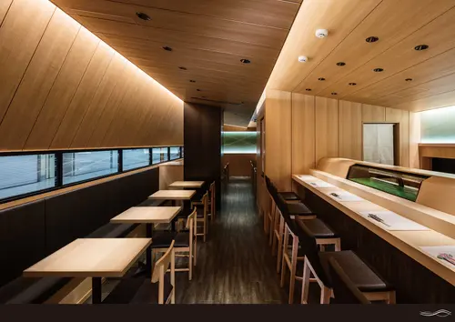 受賞コメント「小屋組みが創りだす ひとつ屋根の下」 ファサードから店内にかけて浜の小屋をモチーフにした屋根組を行うことで、 ひとつ屋根の下の家庭的な寿司屋を表現した。 光に透かした海苔の色を壁面に施す事で空間のアイデンティティーとし、 揺蕩う波のグラフィックは店舗の歴史と家庭的な雰囲気が恒久的に未来へと続く事を目指した。