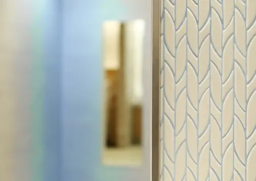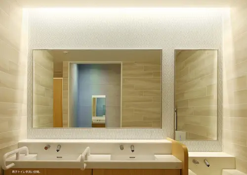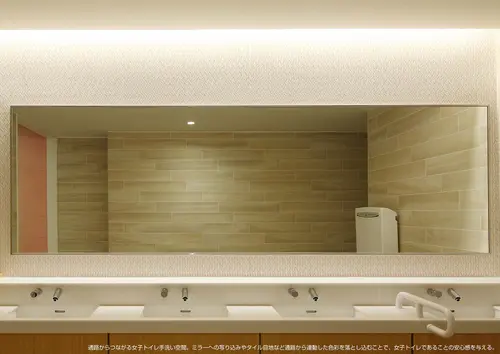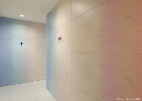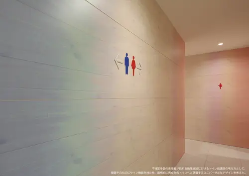 受賞コメント不特定多数の来場者が訪れる大型商業施設においてトイレ前通路を考えるにあたり、ユニバーサル性の高いサイン機能を打ち出すため、壁面そのものにサイン性を持たせた。環境デザインのナチュラルな木目や自然のイメージを守りながら、ブルー・ピンクというカラーを用いることで、直感的に男女を各トイレへと誘導する。自然な流れでお客様を導くことが、大型商業施設におけるホスピタリティであると考える。