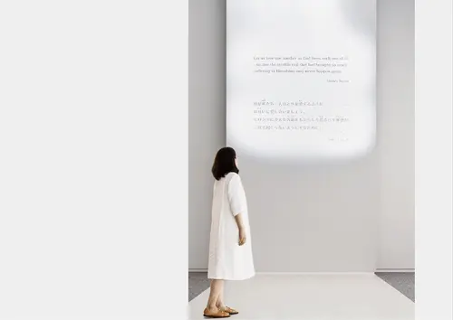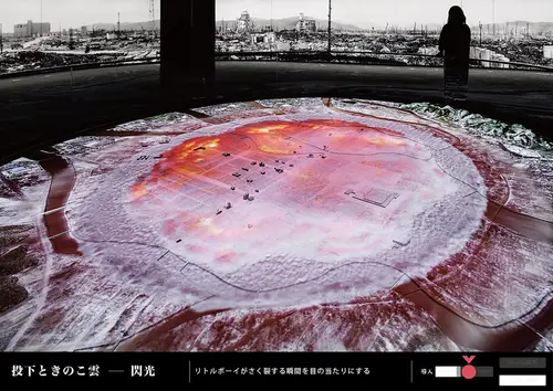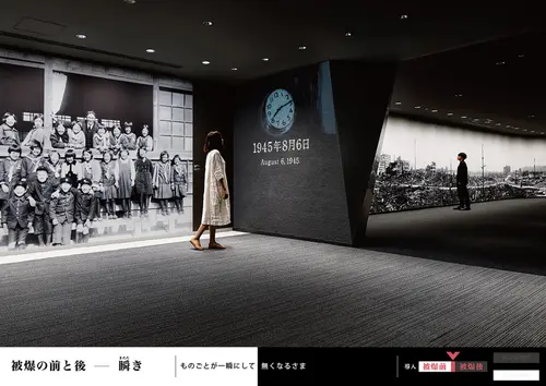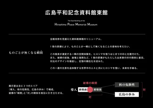 1発の原爆により、ものごとが一瞬にして無くなることの意味を考えたい。この風景が激変する一瞬の空間体験を、ヒロシマを憶うはじまりの印と位置付けた。また、被爆の前後、崩壊と復興など、1発の原爆がもたらした出来事の対の関係に着目、対比のデザインを徹底し、記憶の顕在化を試みた。