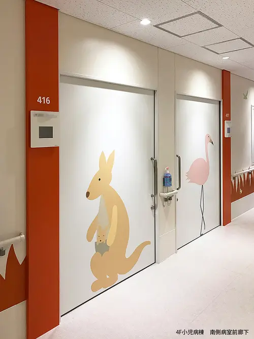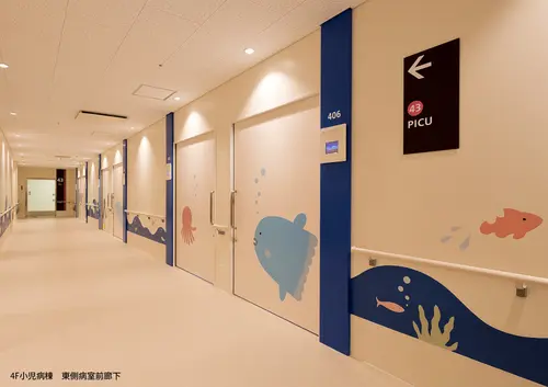 東、南に開かれた廊下壁面や病室、診察室扉に描かれたどうぶつたちは空間を演出するグラフィックに留まらず、