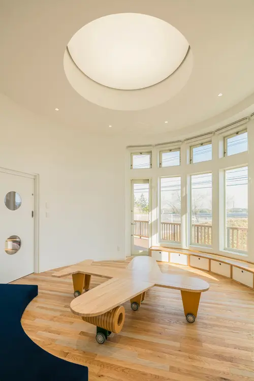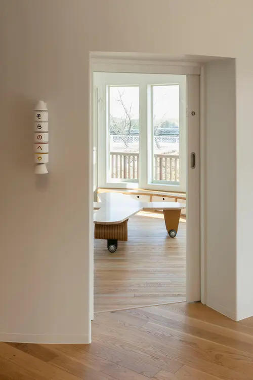 受賞コメント従業員の多様な働き方を支援するための事業所内保育施設。地域性・事業性をキーワードに、地元・相馬の「海」を想起させる環境グラフィックや、野馬追祭にちなんだ馬のモチーフ、また、クライアントの事業「空・宇宙」を表現する飛行機型のテーブル、ロケット型のサイン、床材に星・羽の模様を刻印するなどの工夫を行った。ここで過ごすこどもたちが、 環境や親の仕事に興味を持ち、気づきや学びの機会を提供することを意図した。
