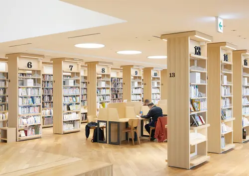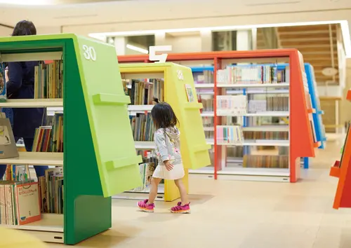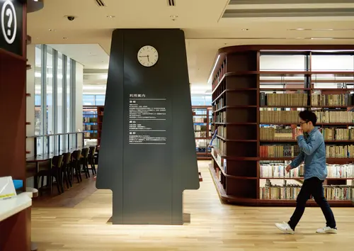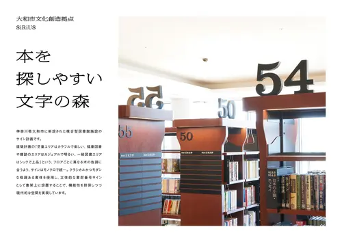 作品意図神奈川県大和市に新設された複合型図書館施設のサイン計画です。 建築計画の「児童エリアはカラフルで楽しい、健康図書や雑誌のエリアはカジュアルで明るい、一般図書エリアはシックで上品」という、フロアごとに異なる木の色調に合うよう、サインはモノクロで統一。クラシカルかつモダンな格調ある書体を使用し、立体的な書架番号サインとして書架上に設置することで、機能性を担保しつつ現代的な空間を実現しています。