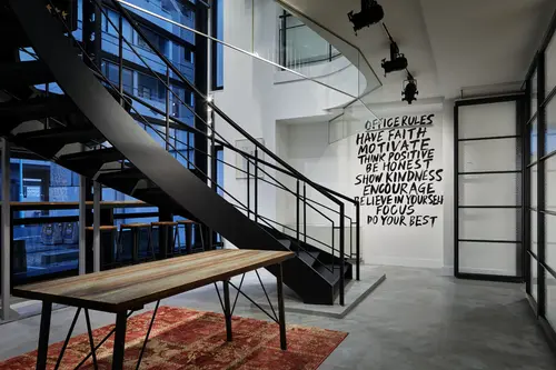 受賞コメント東北新社の新セクション“PRODUCTION 3”のインテリアデザインを手がけました。3番目のプロダクションの新設を、巨大な“3”のアイコニックなアートワークで表現。FACTORYをコンセプトに、4フロアの床は貼り方を変化させ、多様な働き方を支えるオフィス空間を作り出しています。