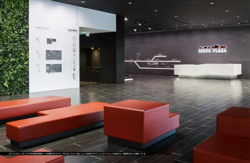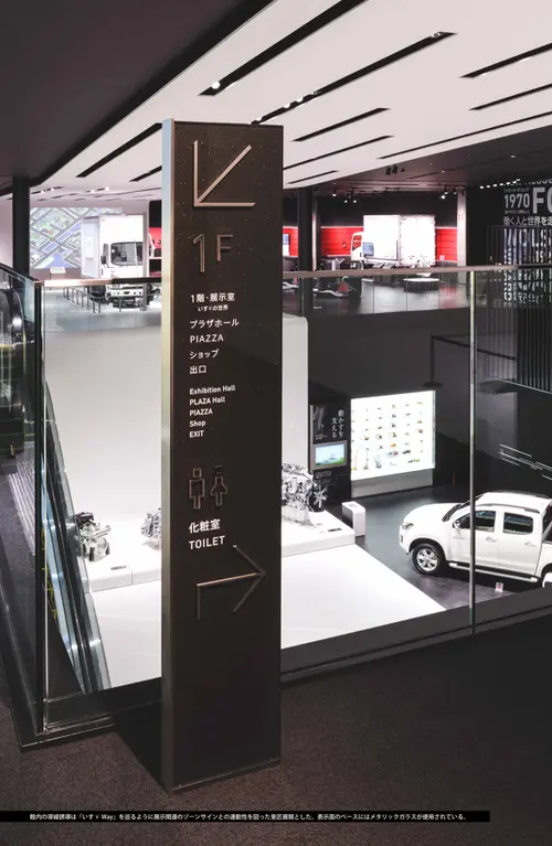 受賞コメント環境・建築・演出・展示が一体として計画された「いすゞプラザ」のサインワーク。全体を貫く「いすゞWay」というコンセプトとの連動とサイン機能面での差別化という相反する要求を満たすために、金属的なテーマ素材で統一された意匠はあくまでもシンプルに表現しつつ空間の中では必要なだけのアピアランスを確保している。「運ぶを支える道」がテーマの空間内で、来館者にシンプルかつクリアな直感理解を促す指針でデザイン・プランされた。