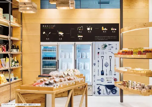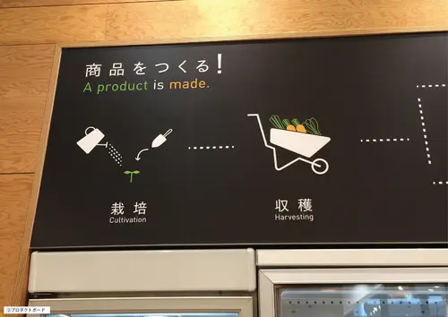 また、商品が出来るまでのプロダクトボード②、生産者+JAのつながりボード、キッチン用具+農具のコラージュ③等を配置。