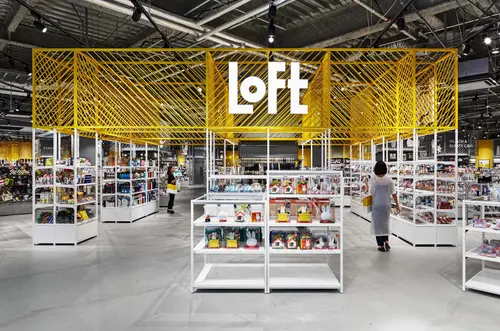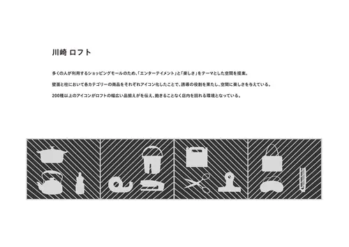 受賞コメント多くの人が利用するショッピングモールのため、「エンターテイメント」と「楽しさ」をテーマとした空間を提案。 壁面と柱において各カテゴリーの商品をそれぞれアイコン化したことで、誘導の役割を果たし、空間に楽しさを与えている。 200種以上のアイコンがロフトの幅広い品揃えがを伝え、飽きることなく店内を回れる環境となっている。