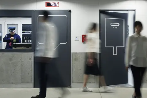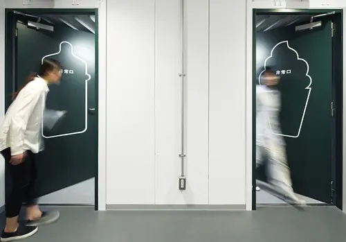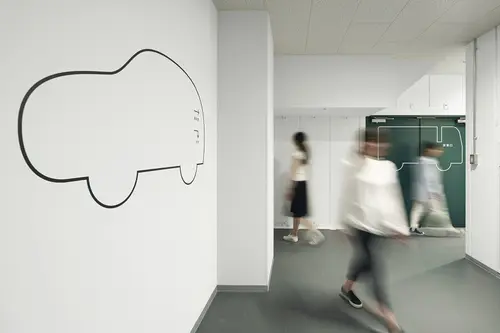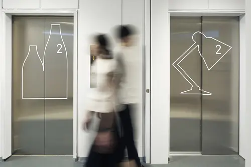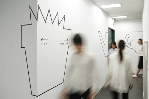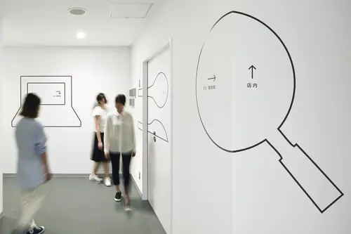 受賞コメント商業施設の従業員導線のサイン計画。多くの人々でにぎわう枚方T-SITEにはたくさんの従業員がいる。彼らが毎日忙しく行き交い、利用する裏導線に各フロアのテーマに沿った商品やサービスのアイコンを室名や誘導サインとセットで配置した。普段は見過ごされている場所に演出的なサインを設置することで売り場との繋がりを強めるとともに、働く環境として生き生きとした場所になることを目指した。