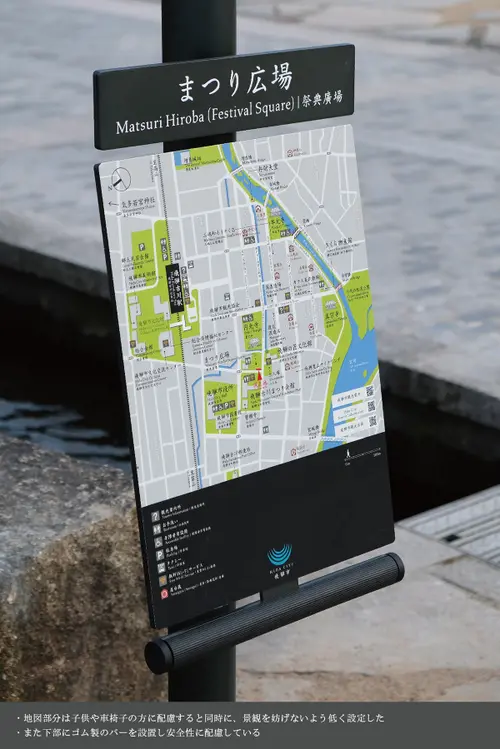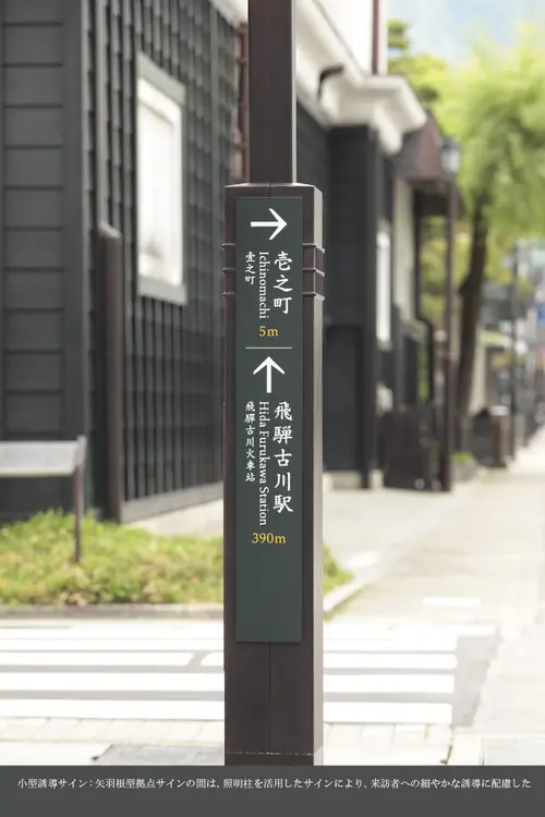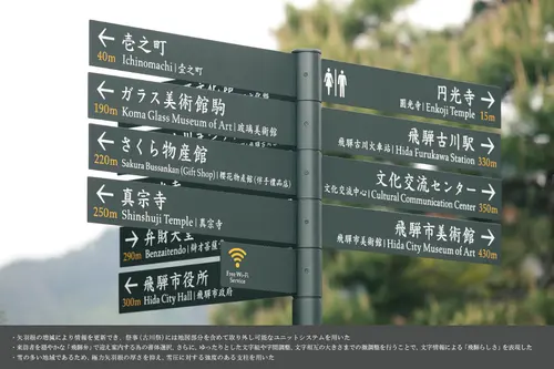 受賞コメント飛騨古川は司馬遼太郎が「みごとなほど、気品と古格がある」と記した町並みが残されている。私たちは、景観に溶け込みながら、来訪者を穏やかな「飛騨弁」で迎え案内する為のタイポグラフィを追求した。本体は、大きさやプロポーション、色彩、雪対策、祭事に分解できること等、市民との検証を重ねて創り上げたものである。職人による木組みの案内板や照明柱をできるだけ活用し、無理なく町の回遊性と品性を高めることに注力した。
