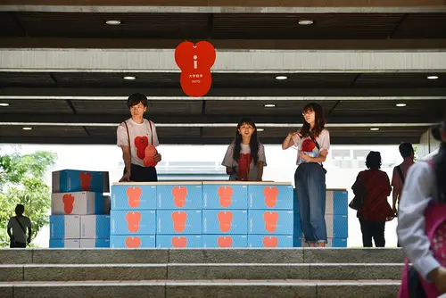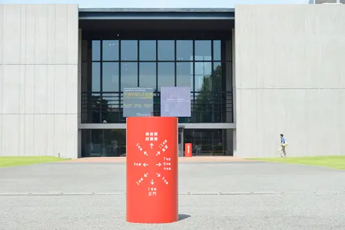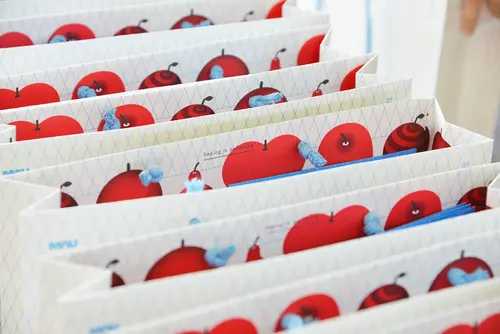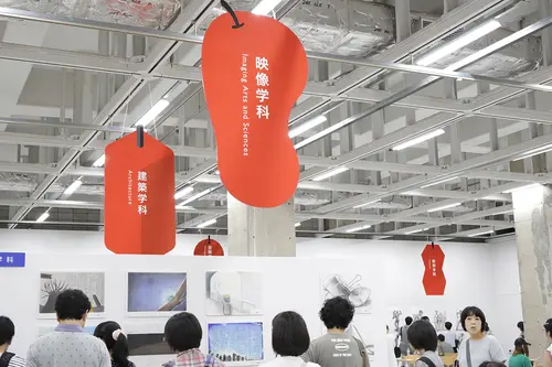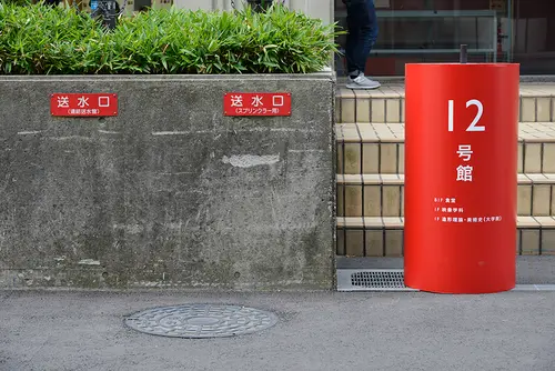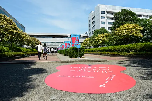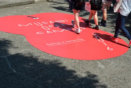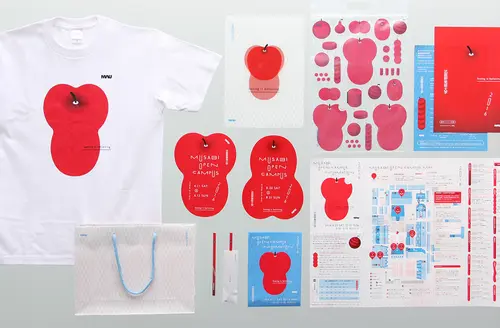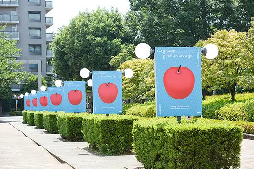 受賞コメント“Seeing is believing. -百聞は一見に如かず-” をコンセプトに据えて、まずは高校生が自分の目でリアルなムサビを見に来て欲しいという願いが込められています。頭の中の想像と限られた情報のみで形作ることの不確実さや曖昧さを「リンゴのようなモノ」で表現しています。様々な曖昧な形の「リンゴのようなモノ」がエントランスバナーや校舎サイン、学部コーナー看板、オフィシャルグッズ等に展開されることで、大学キャンパス空間全体としてコンセプトを表現しています。最後に正門をくぐる時に見えるバナーのみが、本物の「リンゴ」となっており、大学を見た後にはじめて「リンゴ=ムサビ」がわかるという仕掛けになっています。