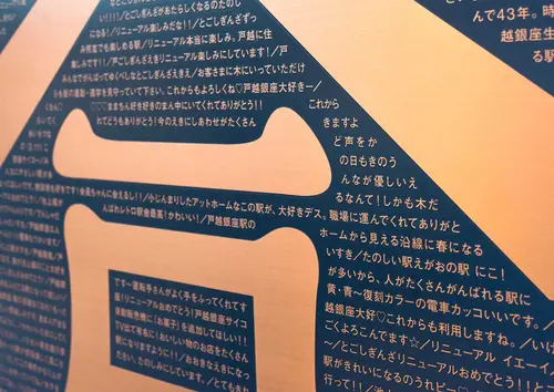 作品意図東急池上線戸越銀座駅のリニューアルに伴ったサイン計画です。 永く愛され続けた駅の特長である切妻屋根の形状を生かし、 新しくて懐かしい駅の顔を作りました。 歴史ある戸越銀座の雰囲気に合わせて出入口には暖簾を設置し、 上り下りで異なる屋根を象徴するようにシンボルをレイアウト。 利用者からのメッセージで構成したプレートや、 旧駅舎廃材を使用したアートが、 かつての駅の趣や想いを継承した新・木造駅舎をより引き立てます。