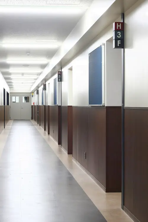 最上段のキューブへのアクセントカラーにより、廊下への彩りを付与。
