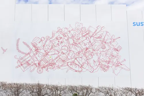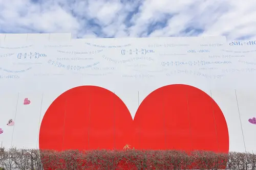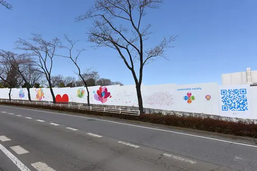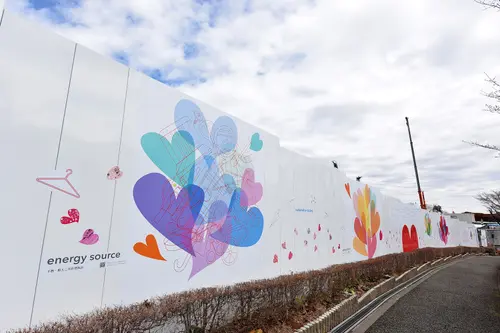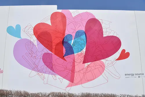 受賞コメント本事業で整備される施設は、東日本において初の一般廃棄物処理へのバイオガス化施設の導入事例となる。新しい施設の意義や価値を視覚情報化させ、多様な世代の方々にプレゼンテーションする場として本件の仮囲いを位置付けた。ごみは不要なもの、汚いものとして思われているネガティブな意識を、「人や環境にやさしく、夢があり幸福な社会を実現する資源」としてポジティブな意識として捉えなおし、「高度先端技術によるハードとハート(国民意識:やさしい心、環境保全の心)がつながり、一体となって発展する」ことが重要であると考えた。基本のメッセージシンボルにハート型を設定し、資源としてのごみの具体的な形を個々にピクトグラム化し、それらがエネルギー源(energy source)となってハート形になるように表現している。ハートの背景にはバイオガスの生成過程を表す化学式を用いて美しい雲の流れ(きれいな空気)を様式的に表現し、施設の特色をアピールした。