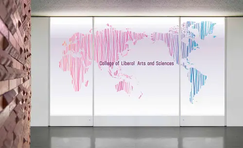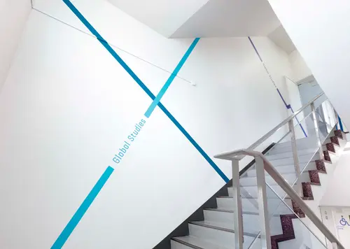 世界地図は、複数の色の重なりで表現していますが、中心となっているのは「すみれ」と名付けた紫色です。これは、今回のプロジェクトに先立って選定した千葉大全学部のサインカラー計画に基づく新学部のアイデンティティカラーです。エントランスに「すみれ」の世界地図があることによって、学部間のコミュニケーションにおいても、国際教養学部の存在感を示すサインとなっています。