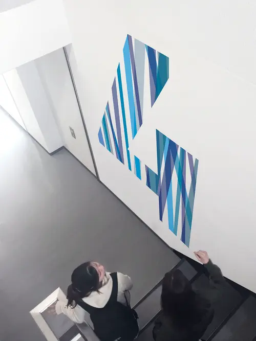 世界地図をモチーフとし、国境を示すことははせずに、多数の「線の集合」で表現しました。傾きも、色も、多様な「線の集合」は、価値観の多様性と一つの考えに固執しない自由な思考力を表しています。