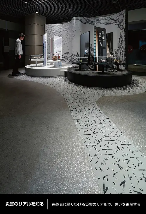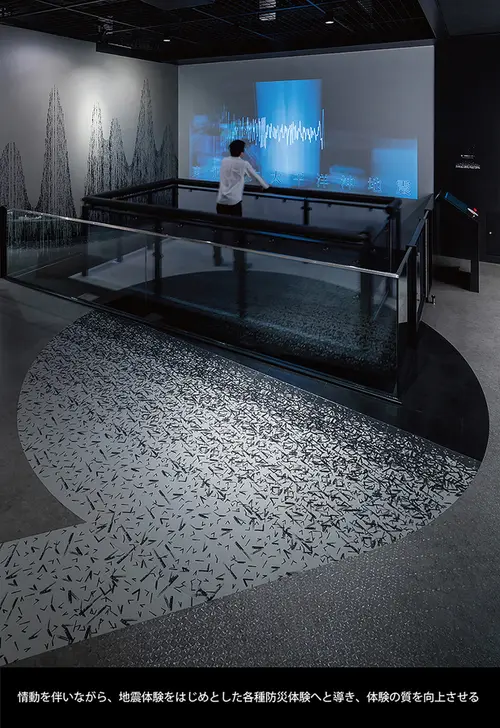 受賞コメント災害に強い地域作りの為に、災害時の対処方法を体験する施設のリニューアル。防災意識向上には、災害を目の当たりにして心を奪われる感覚が大切である。本計画は、災害のリアルによって日常→非日常へと切り替え、その時に湧き上がる人間の「情動」を大切に捉えて自らの行動へと繋げていく防災ストーリーの提案である。手立てとして、情動を示す心の変遷を床、壁、柱で表現し、館内を巡る上での心と体の誘導サインとして展開した。