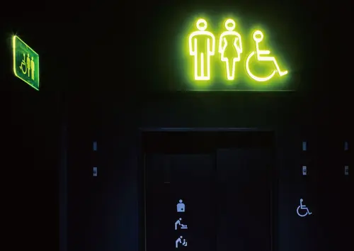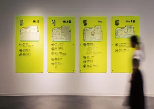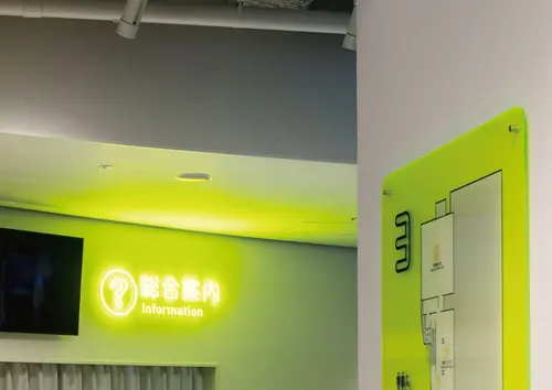 文字の光や、総合案内サイン・突き出しサインで用いた集光アクリル、室内のガラス面などを黄色にすることで全体的に統一感を出しつつ、楽しさ溢れる空間を演出しています。