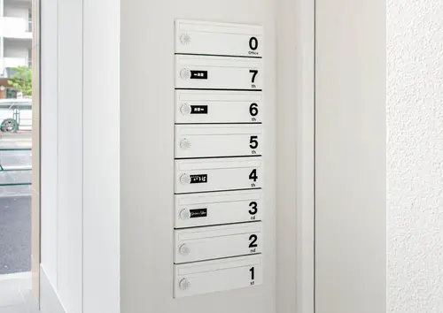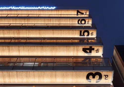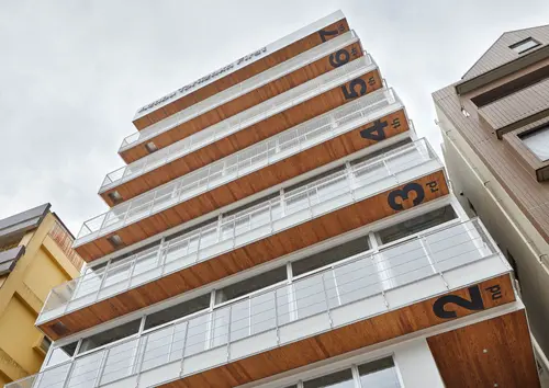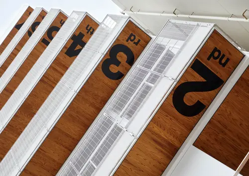 各フロアの軒天部分に、建築を強調するようなダイナミックな階数表示サインを設置しました。