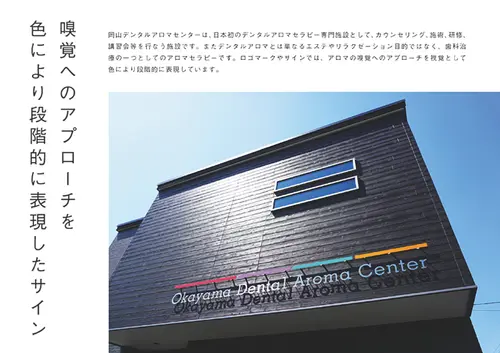 受賞コメント岡山デンタルアロマセンターは、日本初のデンタルアロマセラピー専門施設として、カウンセリング、施術、研修、講習会等を行なう施設です。またデンタルアロマとは単なるエステやリラクゼーション目的ではなく、歯科治療の一つとしてのアロマセラピーです。ロゴマークやサインでは、アロマの嗅覚へのアプローチを視覚として色により段階的に表現しています。