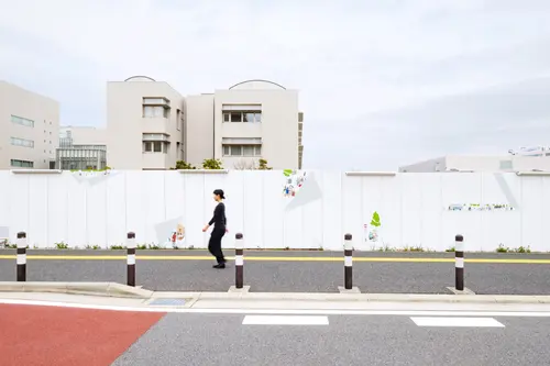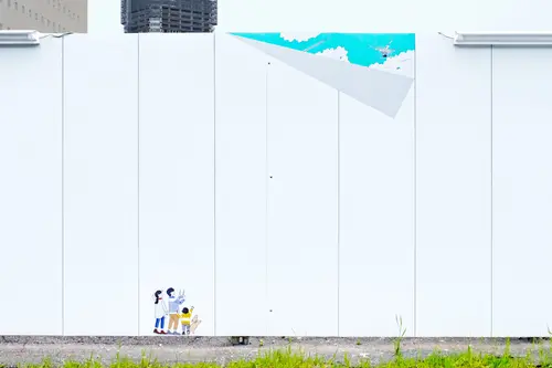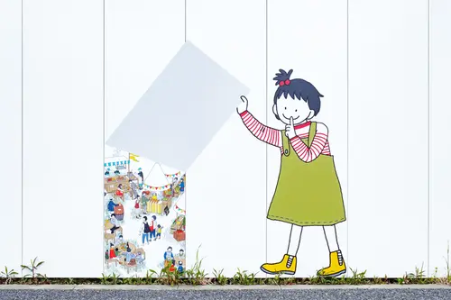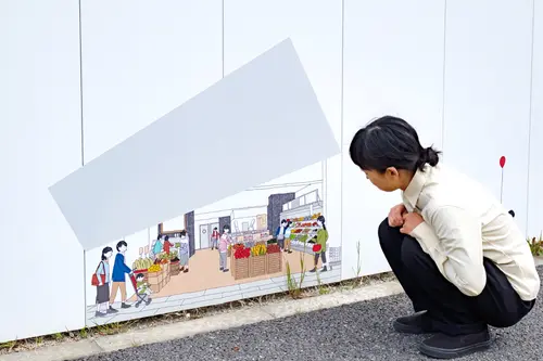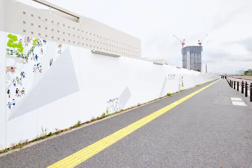 受賞コメント工事用仮囲いの所々がめくられ、イラストで「この街の未来」が表現されています。埋立地の更地からの開発であるため、まだ何もないこの街の開発中や開発完了後の賑わいを覗き見るイメージです。商店街の賑わい、公園でのイベント、マンションのコミュニティ、遊歩道の賑わい、できる予定の施設やあったらいいなという機能など、近い未来からちょっと遠い未来まで、この街で生まれていく様々なシーンを切り抜きごとに描いています。