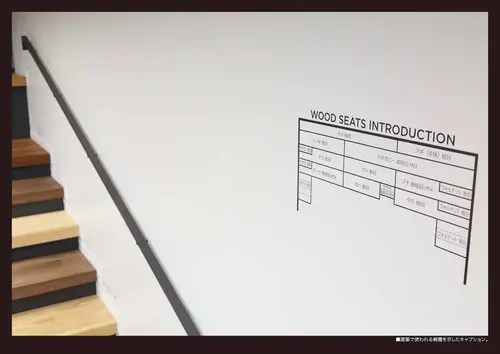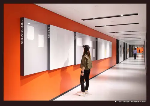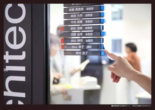 出す仕掛け造りを行っている。学生と教員共に建築に夢中になれるサインデザインです。
