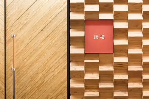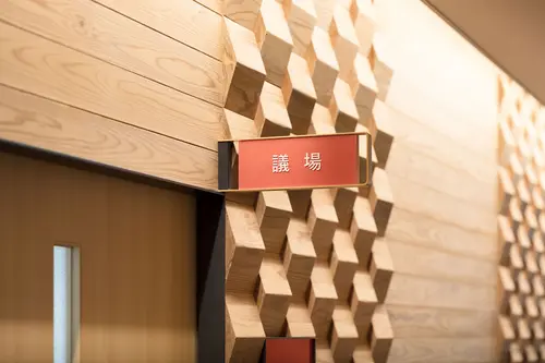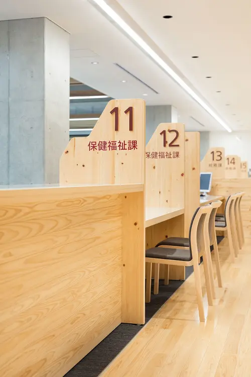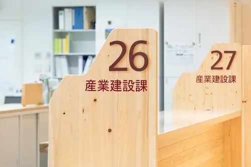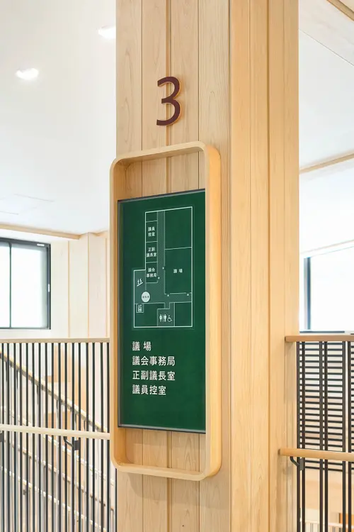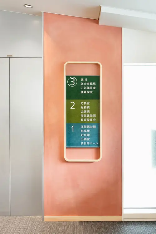 新庁舎のサイン計画では、まちの豊かな自然を建築空間に組み込むことをコンセプトとし地産の素材を採用しました。案内板には地元の製紙場の方とコラボレーションを行い和紙を採用し、サインフレームには建築環境との調和をはかるため木を採用しました。
