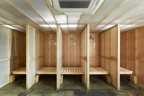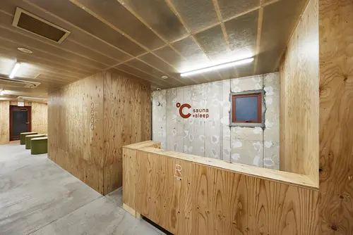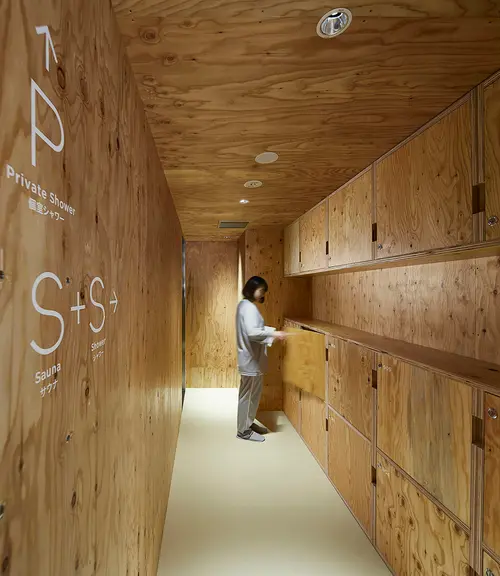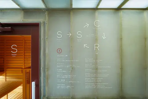 受賞コメントサウナと睡眠に特化したカプセルホテルのサイン計画。内装は赤錆塗装・ラーチ合板・FRP樹脂など様々なマテリアルから構成されている。この内装に対して、男女・サウナ・カプセルなど場所を示すサインはピクトグラムではなく、英語の頭文字を採用した。これは2020年に向け多くの外国人が訪れることを想定し、インターナショナルな空間としてあるこの施設で店舗のシステムを最小限の情報で表現している。また、サウナの楽しみ方を図で表現することで、サウナそのものをシステム化した。