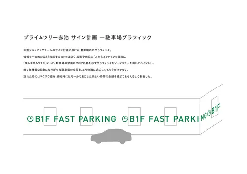受賞コメント大型ショッピングモールのサイン計画における、駐車場内のグラフィック。 情報を一方的に伝え「指示する」のではなく、疑問や状況に「こたえる」サインを目指し、「楽しませるサイン」として、駐車場の壁面にフロア名称を示すグラフィックをゾーンカラーを用いてペイントし、暗く無機質な印象になりがちな駐車場の空間を、より快適に過ごしてもらうだけでなく、訪れた時にはワクワク感を、帰る時にはモールで過ごした楽しい時間の余韻を感じてもらえるよう計画した。