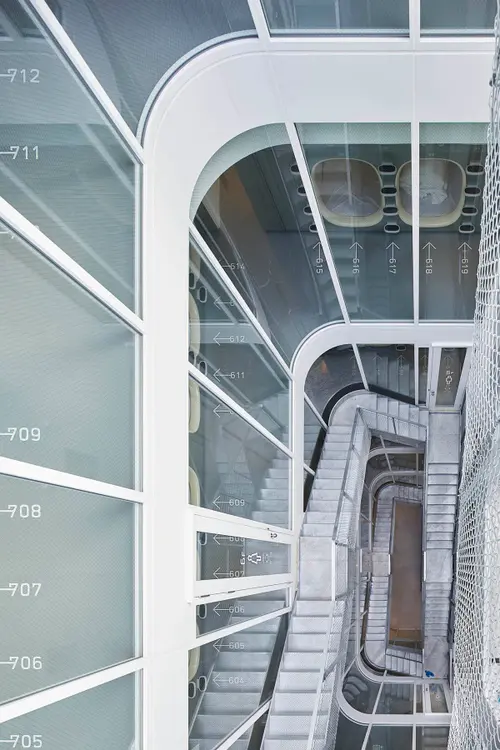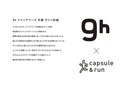 作品意図カプセルホテル、ナインアワーズ竹橋店のサイン計画。高品質なランニングステーションを提供する。建築は館中央の吹き抜け階段に沿ってガラス貼りで仕上げることで、限られた敷地内を効果的に広く感じることのできる空間となっている。サインは広々と感じることのできる建築の造りに合わせてシンプルに配置していき、全体のバランスがとれるように計画した。ガラスにもフロアマップや誘導サインを施すことで、館全体が魅力的な空間となるよう目指した。