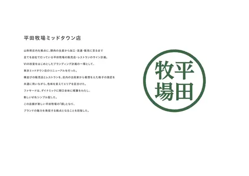 受賞コメント山形県庄内を拠点に、豚肉の生産から加工・流通・販売に至るまで全てを自社で行っている平田牧場の販売店・レストランのサイン計画。VIの改変をはじめとしたブランディング計画の一環として、東京ミッドタウン店のリニューアルを行った。横並びの販売店とレストランを、庄内の古民家から着想をえた格子の意匠を共通に用いながら、色味を変えてエリアを区分けた。ファサードは、ダイナミックに開口全体に暖簾をわたし、新しいVIをシンプル配した。この店舗が新しい平田牧場の「顔」となり、ブランドの魅力を発信する拠点となることを目指した。