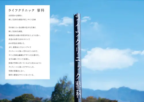受賞コメント自然豊かな蓼科に新しく出来た病院のVI、サイン計画。目の前に八ヶ岳山脈の広がる立地に新しく出来た病院。象徴的な山脈の形状をVIにしようと思い、青色の水彩で1本のラインで山の景色を表現した。また、建築はとてもシンプルでディティールに拘って作られているので、サイン計画も繊細なデザインを心掛けた。文字は細いラインで表現し、情報が空間に浮いているように見えるようにディティールに拘ってデザインした。空間の邪魔をしない、場所に馴染むサインになっている。
