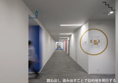 という操作を組み合わせて空間全体でサインを表示することで、目的地や居場所をわかりやすく認識できるシステムサインとした。