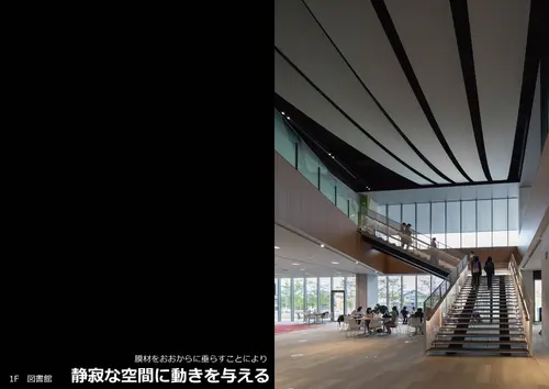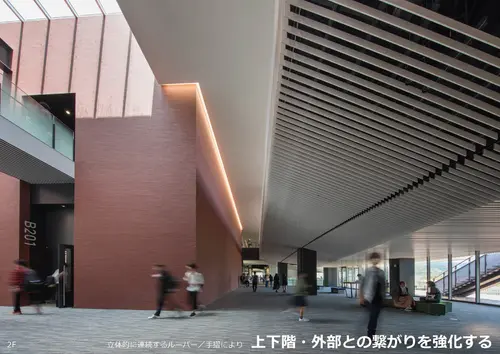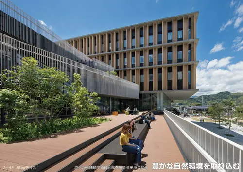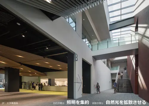 受賞コメント地方中核都市型キャンパスの利点を活かし、周辺環境を取り込みながら建物内に都市的な交流の場を形成した。新キャンパスのメイン通路であるこの“キャンパスリビング”は「キャンパスの大動脈」だけでなく「近接する諸室から機能のにじみ出しを演出」し、「外部環境を各室へ届ける媒体」として機能する。外部のステップテラスと連動し立体的なリビング空間-異なる要素が偶発的に絡み合う学生の居場所-を創造した。