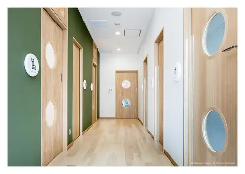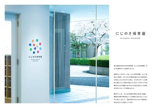 受賞コメント富士通株式会社の社内保育園「にじのき保育園」のロゴと園内サインを制作しました。 施設のシンボルマークは「にじのき保育園」という名前から発想し、ひとりひとり個性の違う子ども達を様々な色をした小さな木々に例え、その木々が一つの場所に集まっている様子を表しています。ロゴタイプでは、園児たちの不器用でありながらも活き活きとした姿を文字のストロークで表現しました。 園内サインは、子どもの目線も考慮し低めに設置し、建物内の扉や掲示板といった要素に合わせふっくらと丸い形にしました。空間全体がやわらかい雰囲気に包まれるように設計しています。