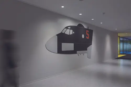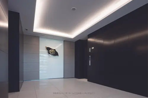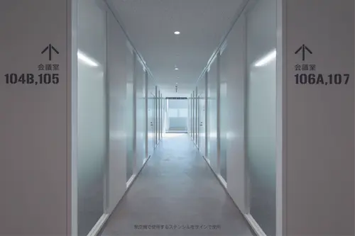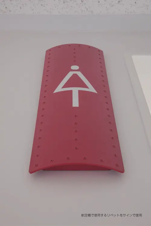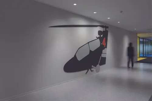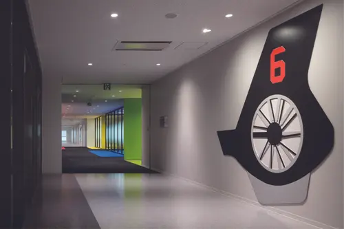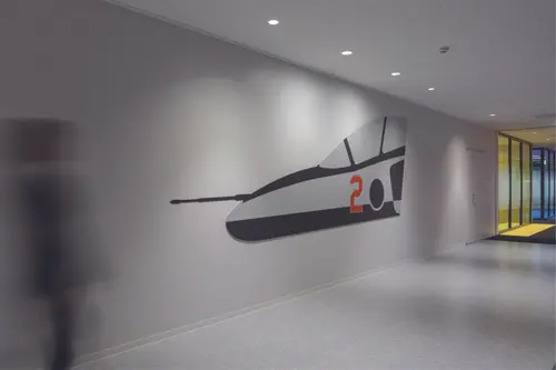 執務室のエレベーターホールの階数サインは航空機の一部を再現し、設計者のこだわりと思いを