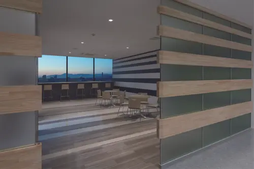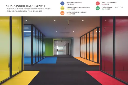 自由な発想によるものづくり、人と人とのつながりの向上を促進する動的な空間を表現した。