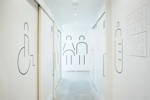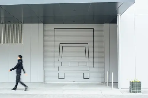 この細く一定の太さで作られたロゴをサイン計画に展開していく際、