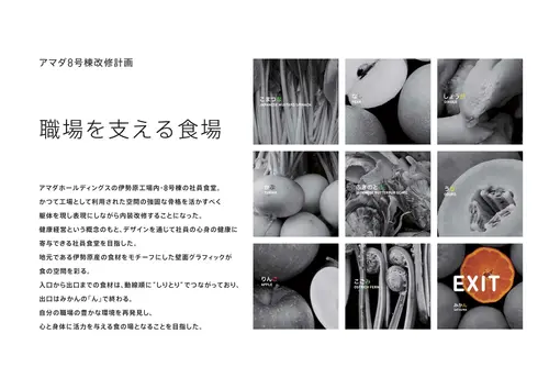 地元である伊勢原産の食材をモチーフにした壁面グラフィックが食の空間を彩る。