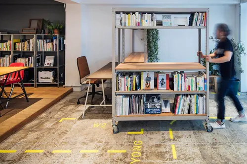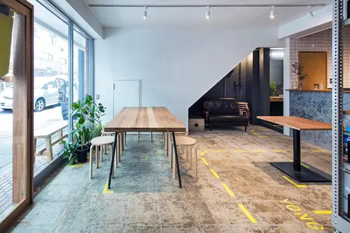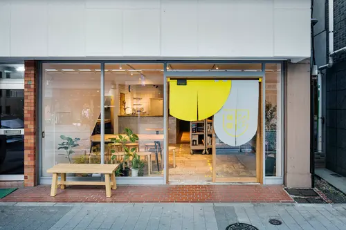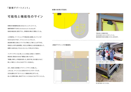 受賞コメント西横浜の藤棚商店街にあるコミュニティスペース。ここはワークショップやイベントだけでなく、チャレンジショップとして、実店舗を構える前にトライアルの場として使うことができる。新しいことが起こる場所という意味で、ファサードには、商店街に馴染みのある「暖簾」を使いながら、今までにない「暖簾」の表現の可能性を探った。また、床面のグラフィクサインは、イベントで動かしたワゴンやテーブルを戻すガイドとなる機能を持たせている。