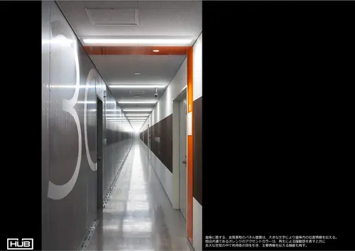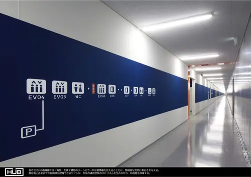 無機質な空間の中で躍動感を表すアクセントカラー、長大な空間の中で海側山側の場所を認識させるゾーンカラーを用いて大きな文字やピクトによるサイン計画とした。