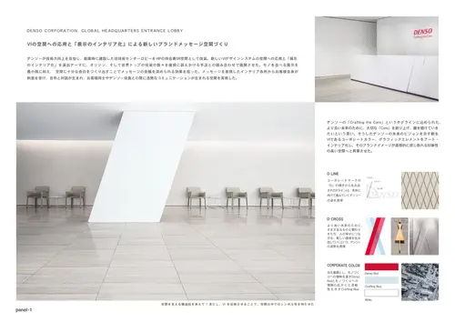 受賞コメントデンソーが技術力向上を目指し、創業時に建設した旧技術センターをVIPの待合兼SR空間として改装。VIデザインシステムを空間に応用し「展示のインテリア化」を演出テーマにオリジン、そして世界トップの数々の技術力を直感に訴えかける手法で展開させた。モノを並べる展示を最小限に抑え、空間に十分な余白を創り出すことでインテリア各所からタグラインに込められたメッセージを感じ、自然と対話が生まれる空間を実現した。