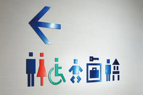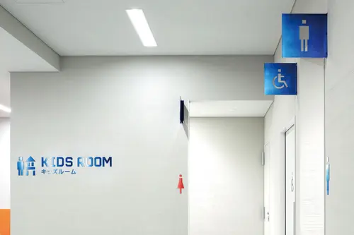 共用部のサインは青を基調としたカラーアルマイトで作成。