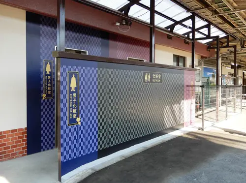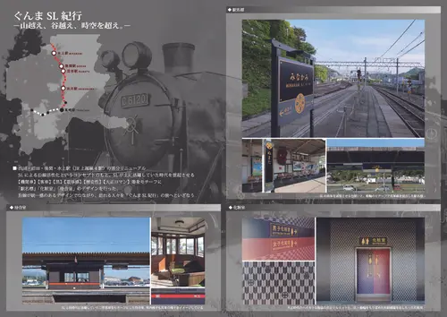 SL機関車が街を走ることによって感じるノスタルジー。当時の三等客車をイメージした待合室、SLの重厚感を思わせる駅名標、大正ロマンの矢絣柄と男女シルエットを施した化粧室。夕暮れには内照の駅名標が優しく灯る。SLの時代背景や歴史、タイムスリップ感覚を味わって頂きながら、地域を訪れるお客さまを「ぐんまSL紀行」の旅へと誘う。